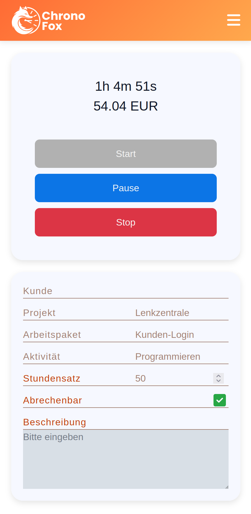 ChronoFox vereint Zeiterfassung, Projektmanagement, Kundenverwaltung und Abrechnung in einer übersichtlichen Plattform. Keine Excel-Tabellen, keine getrennten Tools mehr – alles, was Sie brauchen, direkt zur Hand.